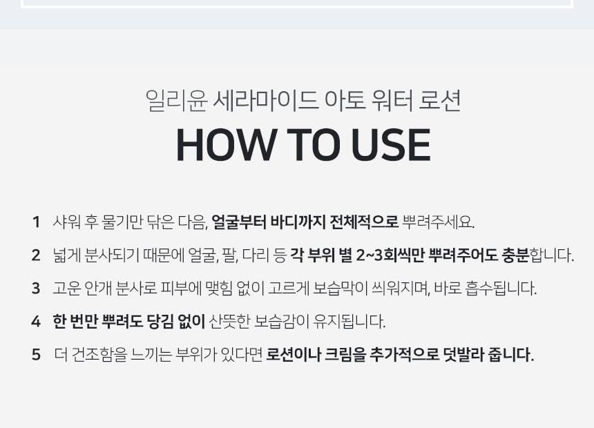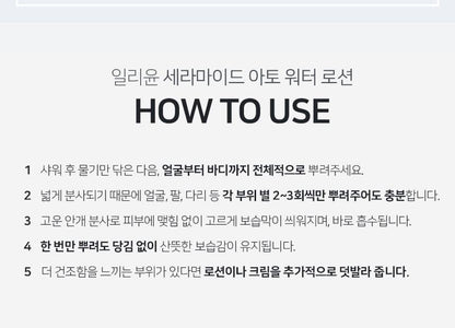 How to Use: - After shower, just wipe off the water and spray it all over the face to body. -Because it is sprayed widely, it is enough to spray 2 to 3 times per area such as face, arms, and legs. -It is applied evenly to the skin with fine mist spray. It is absorbed immediately. -It maintains a fresh moisturizing feeling even after a single spray. -If you feel more dry, add more lotion or cream.