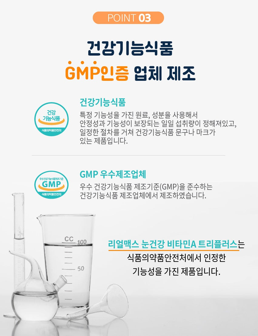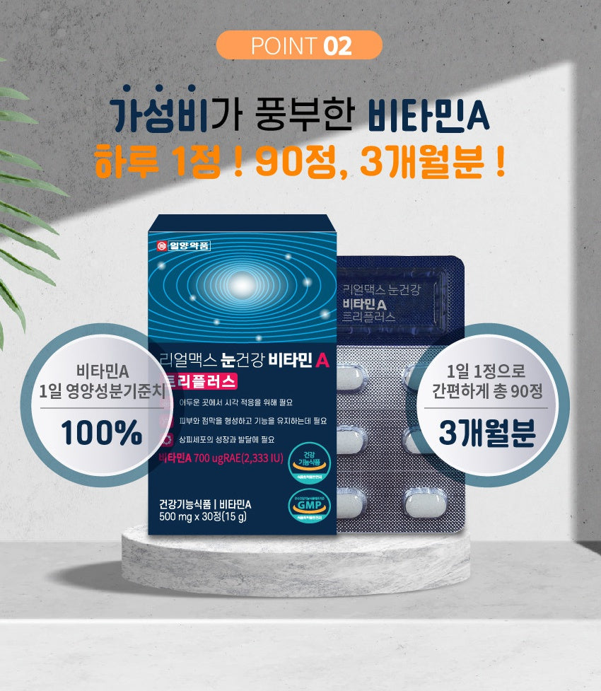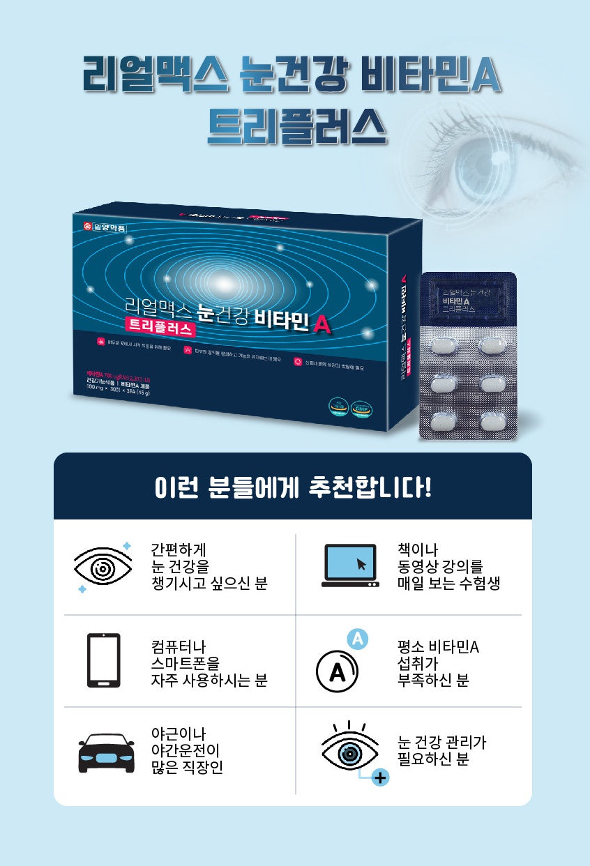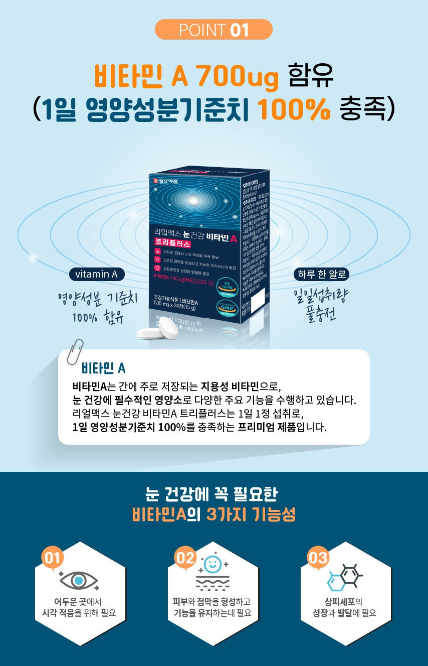If you take one tablet a day, you can consume all the recommended daily intake of vitamin A according to the Ministry of Food and Drug Safety. It contains vitamin C, vitamin E, zinc, vitamin B1, vitamin B6 as auxiliary ingredients.