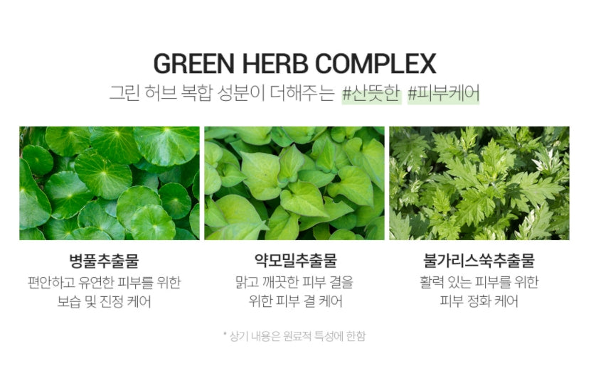 Green Herb Complex (Centella asiatica extract, yam extract, Bulgaris mugwort extract): Centella asiatica extract provides moisturizing and soothing care for comfortable-feeling, supple skin. Herbal wheat extract and bulgaris mugwort extract refresh your skin and promote clarity and vitality.