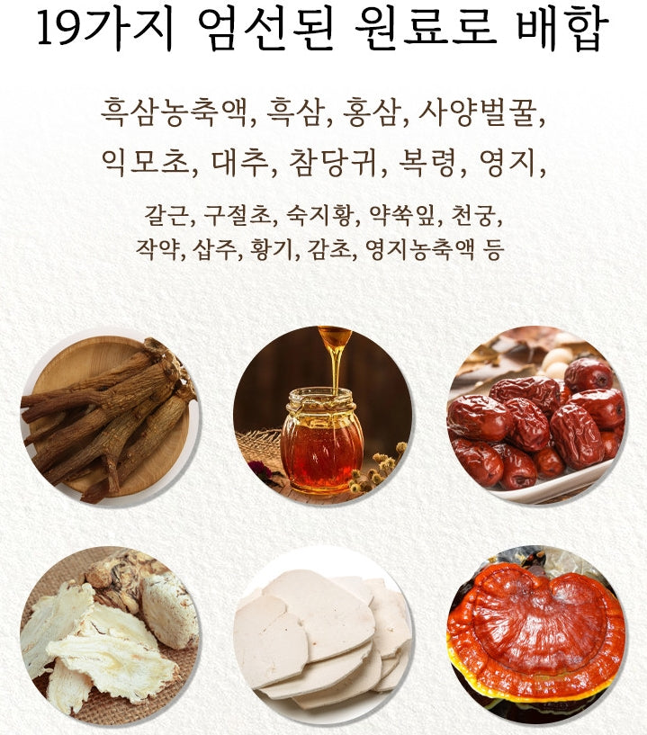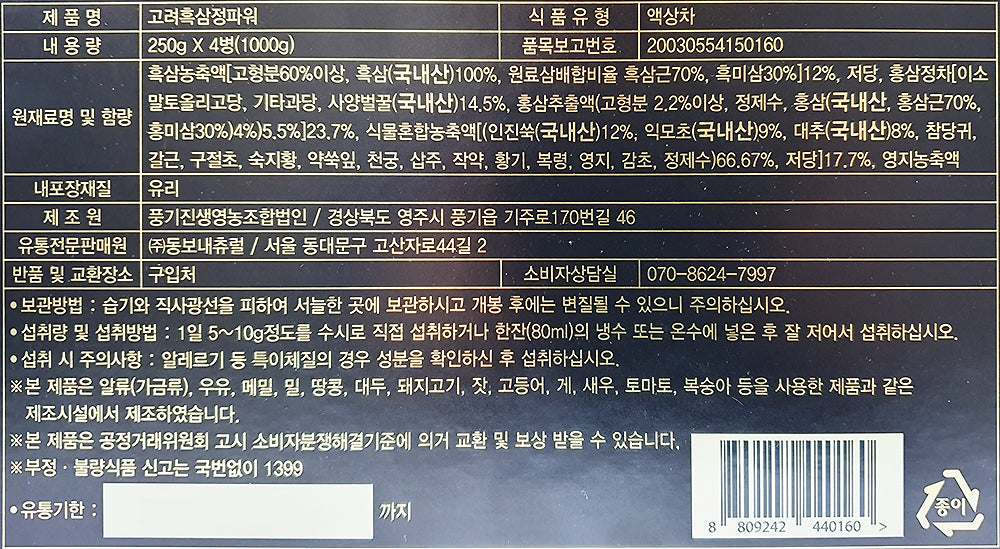 *Mix Ratio of Black Ginseng : Black Ginseng root (korea) 70%, Black Ginseng root Tail 30% (korea)] Red ginseng extract Tea 23.7% [isomalto-oligosaccharide, Honey 14.5%, Other fructose, Red Ginseng Extract (solid Over 2.2%, Purified Water, Red Ginseng (Red Ginseng root (korea) 70%, Red Ginseng root Tail 30%)4% etc..