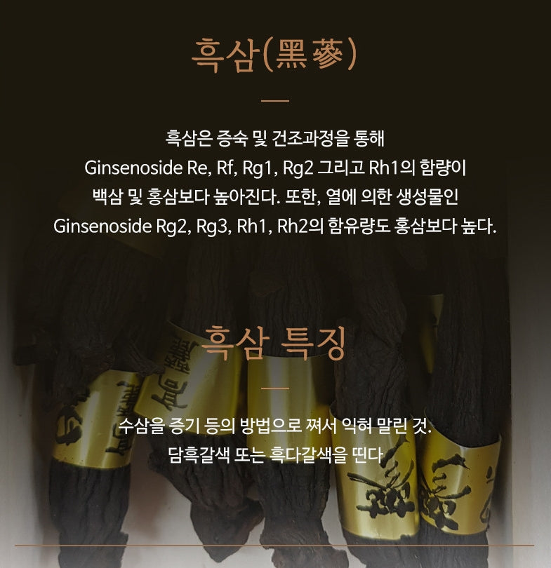 As processing of steam and dried 9 times,Ginsenoside RG3,RH1,RH2 ( Saponin) is made and this is 100~9,000 times higher level than normal Red Ginseng so it calls Black Ginseng is specialized functional Ginseng. Normal Red Ginseng needs only one time of steam and dried process but Black Ginseng does 9 times of that. it takes only for 3 days to get Red Ginseng but Black Ginseng takes 50 days for 9 times of steamed and dried process with master's hands.