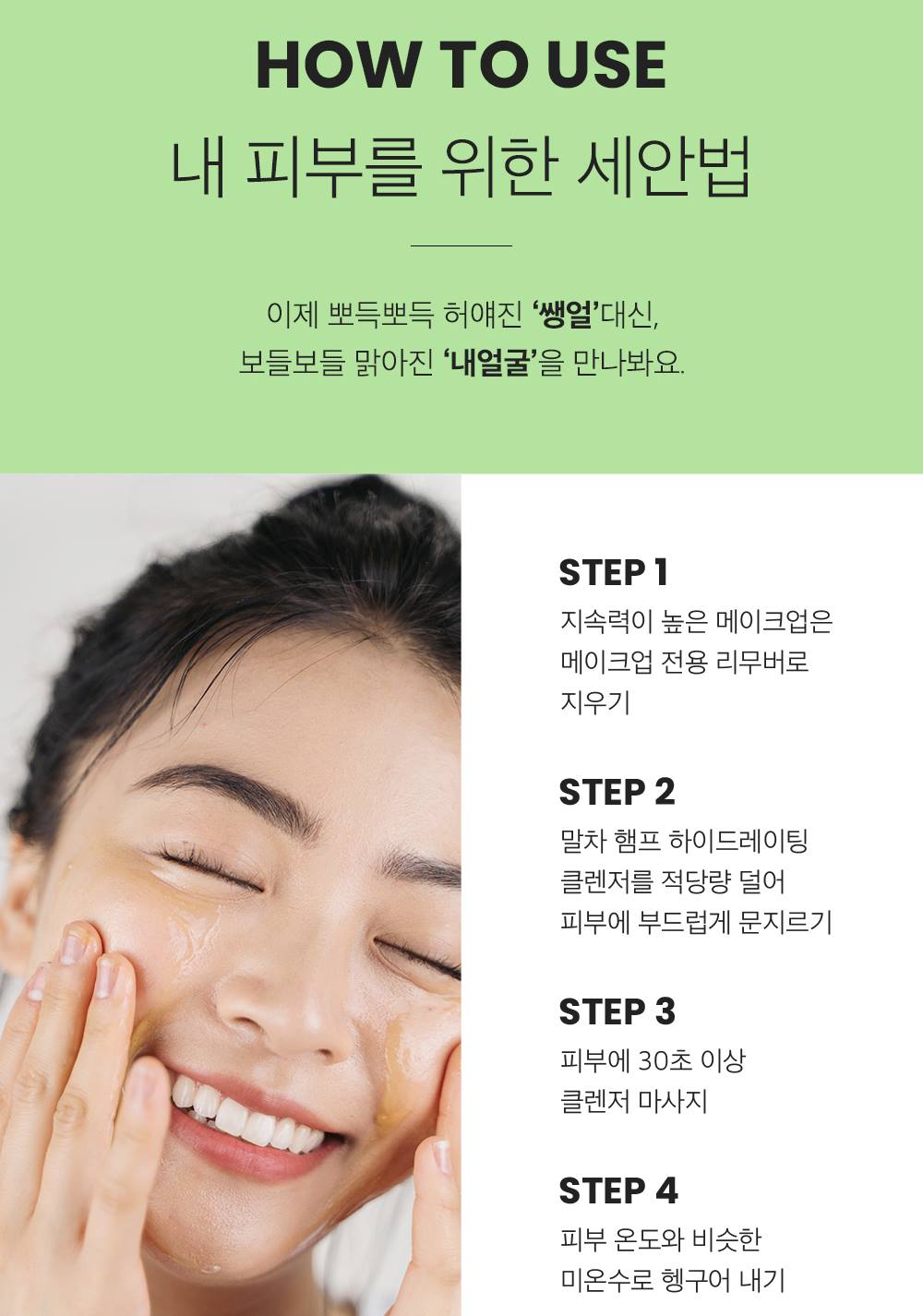 Squeeze an appropriate amount into palms and lather up. Massage over face and then thoroughly rinse with lukewarm water.