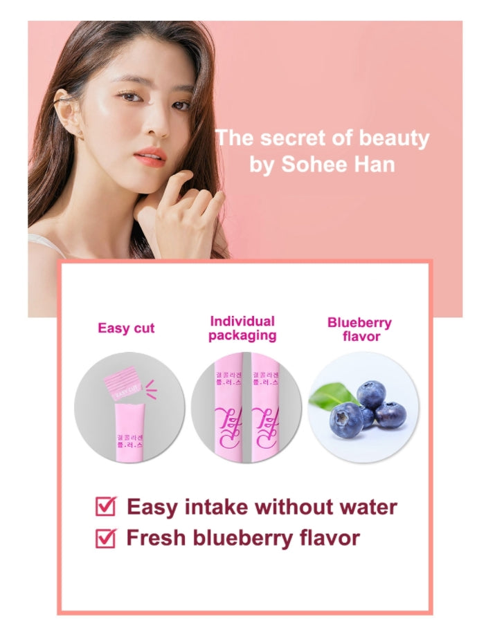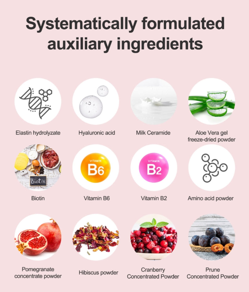 Ingredients: Fish Collagen Peptides (Fish Scale: Italy), Dextrose Anhydrous, Vitamin C, Blueberry Concentrate Powder [Blueberry Concentrate (USA), Dextrin, Gum Arabic], Agave Powder [Agave Powder (Mexico), Maltodextrin], Xylitol, Artificial Fragrance (Blueberry Flavoring Powder), Silicon Dioxide, Freeze Dried Aloe Vera Powder, Pomegranate Extract Powder, Vitamin B₆ Hydrochloride, Magnesium Stearate, Hibiscus Sabdariffa Extract Powder, Mixed Amino Acid Powder, Vitamin B₆ Hydrochloride, Elastin Hydrolysate, Vitamin B2, Hyaluronic Acid, Sucralose (Sweetener), Cranberry Concentrate Powder, Prune Concentrate Powder, Biotin, Milk Ceramide (Contains Dairy).