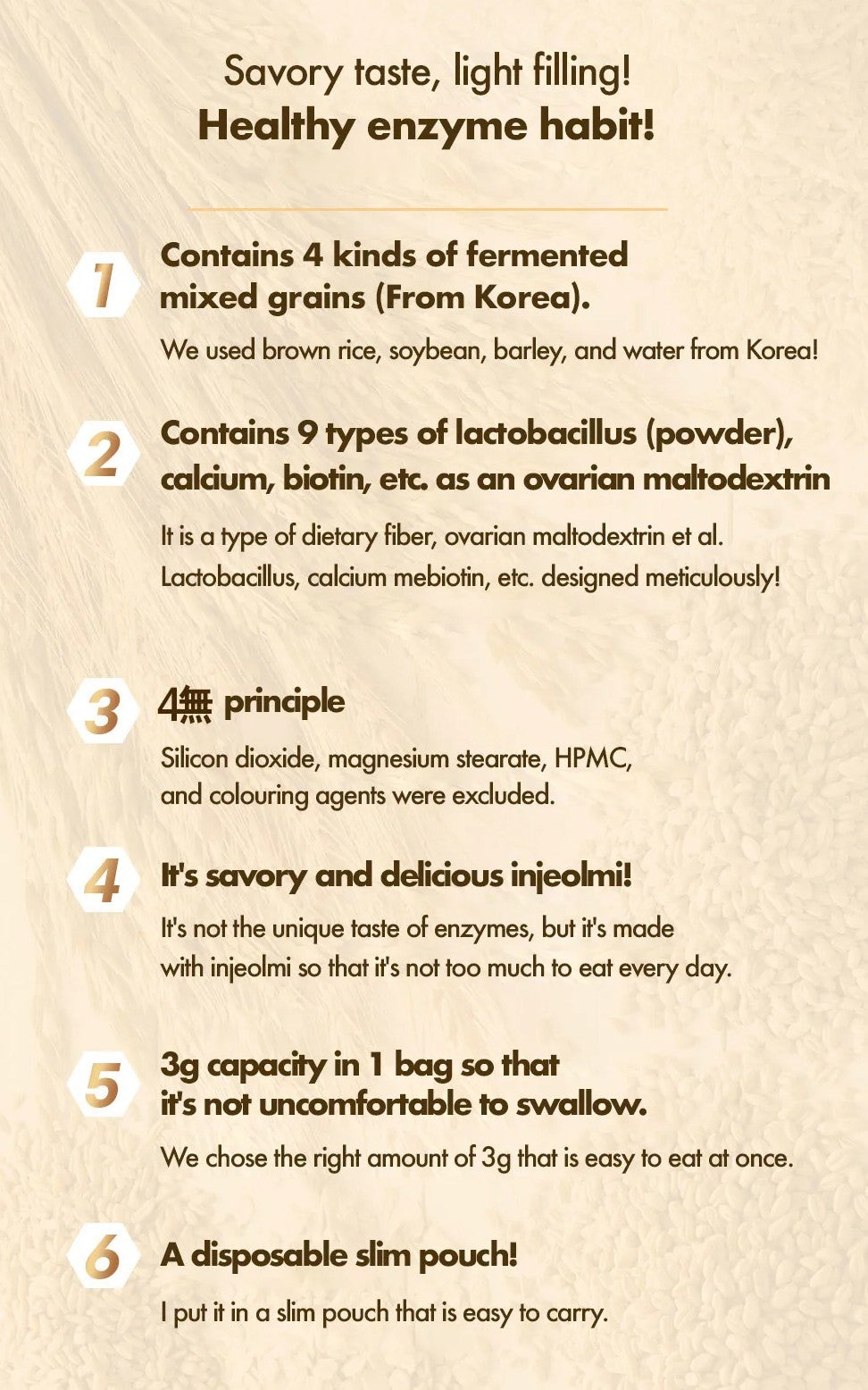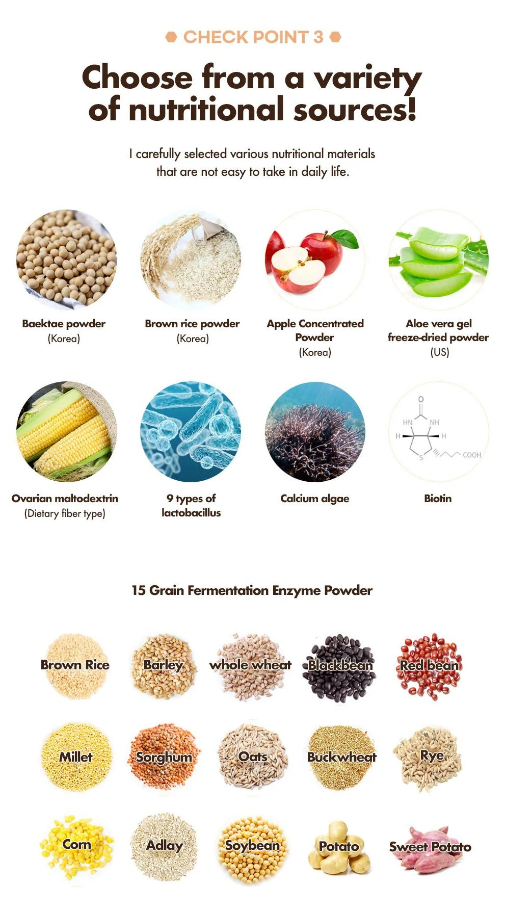 1- Contains 4 kinds of fermented mixed grain (From Korea). We used brown rice, soybean, barley, and water from Korea.