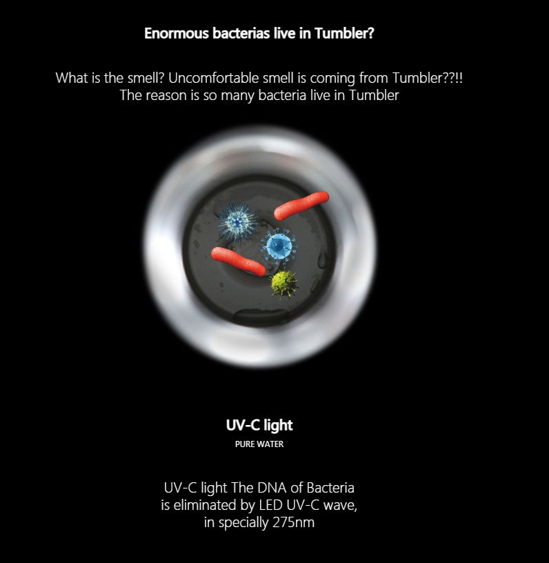 The LED UV-C technology eliminated 99.9% germs which is inside Tumbler. The First Tumbler , Adopt UV-C technology !!
