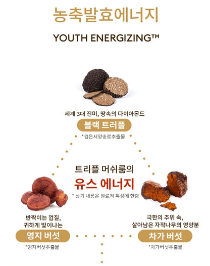 The concentrated fermented energy of black truffle extract, reishi mushroom extract, and chaga mushroom extract is delivered to the skin to solve skin aging concerns.