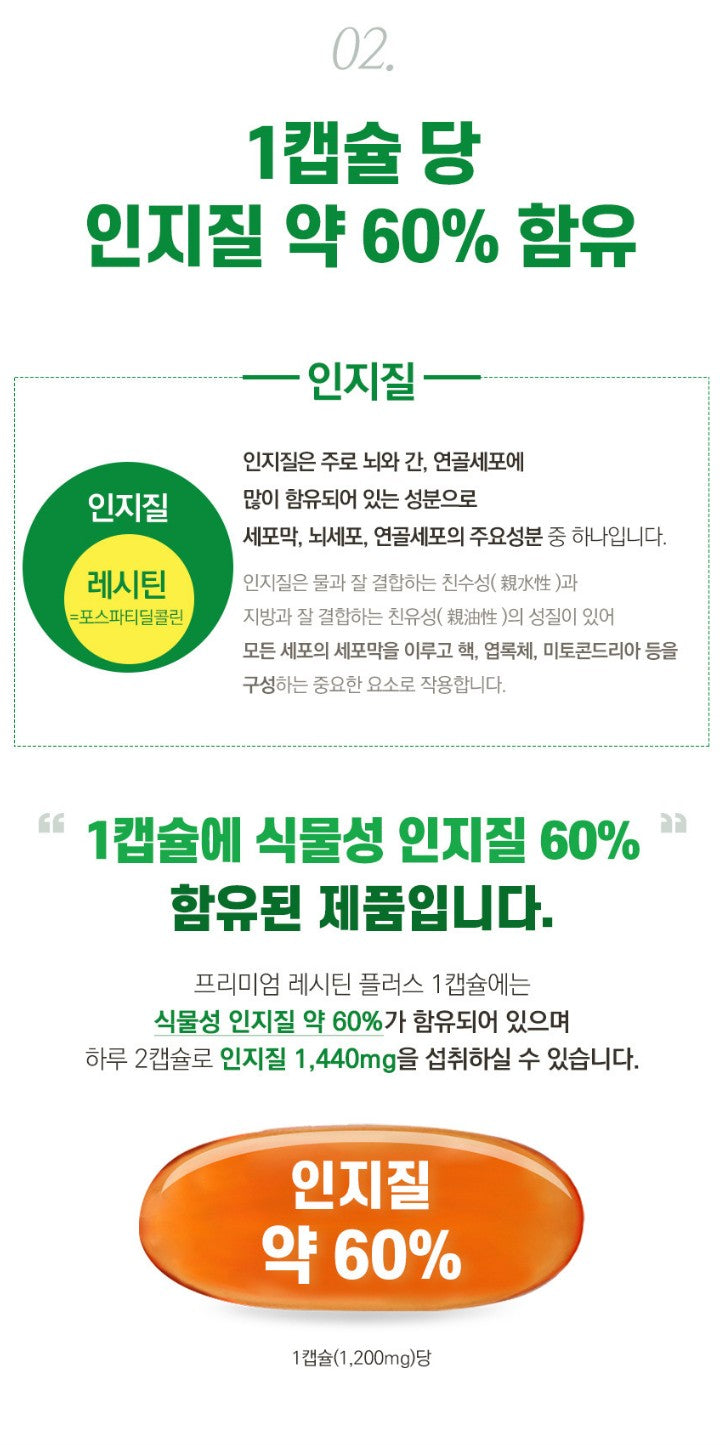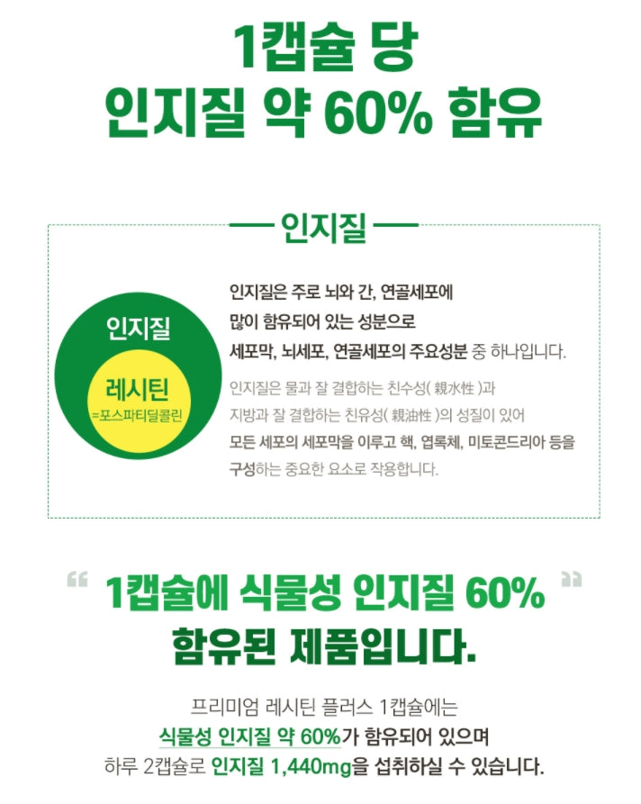 Premium Lecithin Plus 1 capsule contains about 60% vegetable phospholipids, and you can consume 1,440 mg of phospholipids with 2 capsules a day.