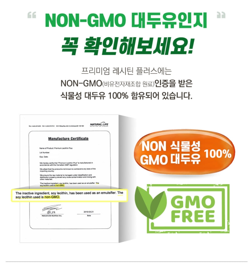 Premium Lecithin Plus contains 100% vegetable soybean oil certified as Non-GMO (Non-GMO).