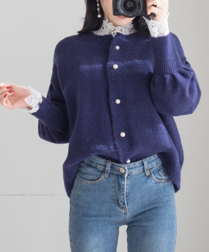 Navy Blue Puff Sleeved Wool Blend Cardigans