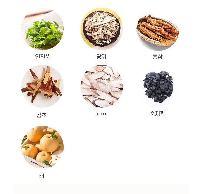 Main ingredients : red ginseng, pear, Redstem wormwood, angelica, Glycyrrhiza uralensis Fischer, Rehmannia glutinosa Preparata.