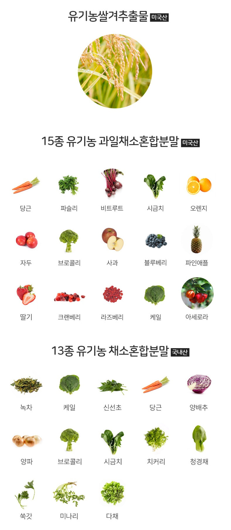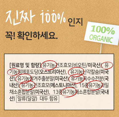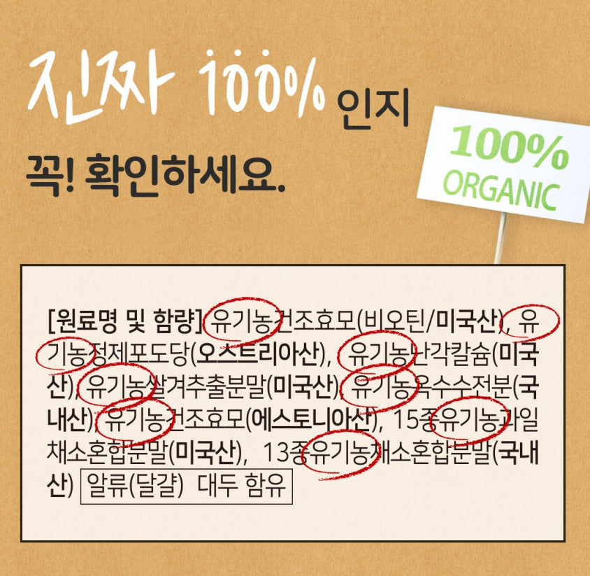 Organic Yeast Yeast (Biotin/USA), Organic Refined Glucose (USA), Organic Rice Extract (Inside), Organic Corn Starch (Inside), Organic Dry Yeast (Estonia), 15 Organic Farming USA, 13 Organic Vegetable Mixed Production ,Domestic industrial powder, egg.