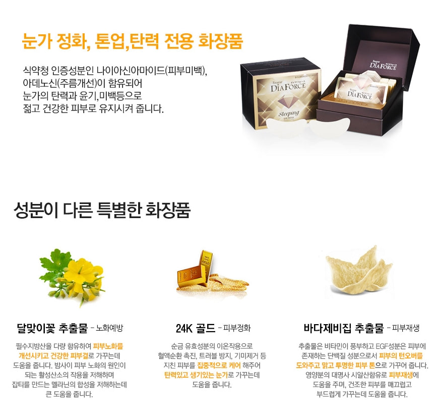 24K Gold: skin purification, gold ions act as active ingredients in the blood circulation, prevent problems, and resilience haejueo care for tired skin, such as removing blemishes intensively it gives help to cultivate a lively eyes.