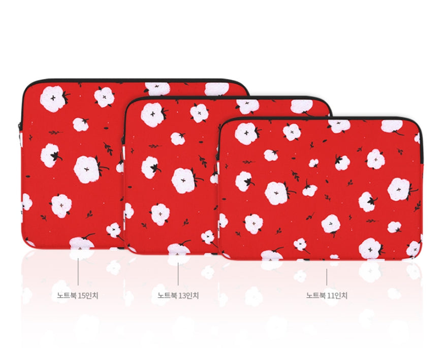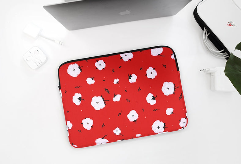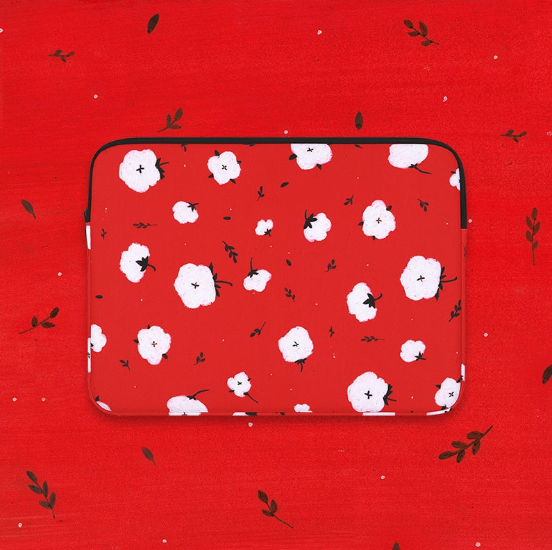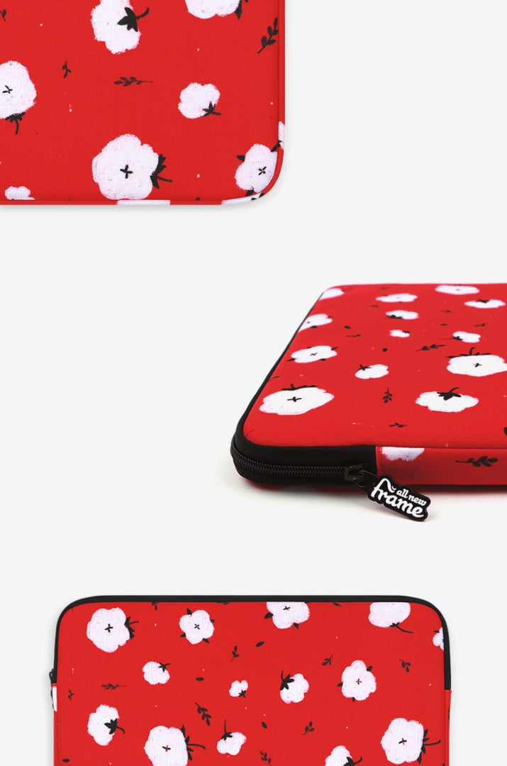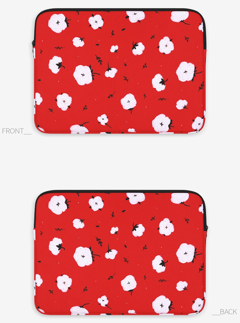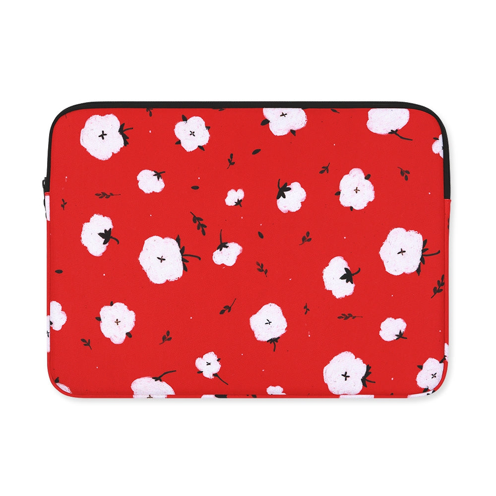 Red Cotton Floral Graphic Laptop Sleeves 11" 13" 15" inch Cases Protective Skins Covers Handbags Square Pouches Designer Artist Prints Cute Lightweight Collage Office Zipper Fashion School Unique Couple Item Gifts