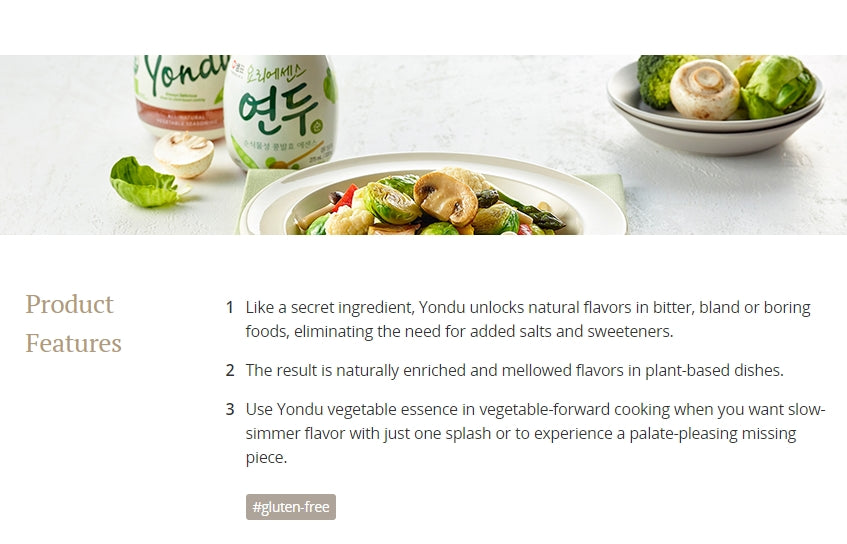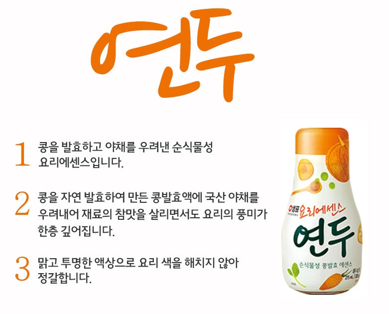 Yondu is made by fermenting soybeans. It is a pure vegetable soybean fermentation essence that balances the taste with domestic vegetables by ssing the natural taste ingredients of beans through Semipo's unique fermentation technology.