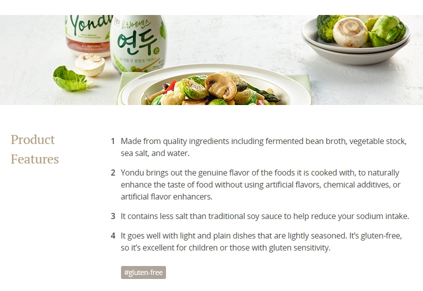 Ingredients : Fermented Soybean Essence(Soybean, Water, Salt), Vegetable extract(Onion, Radish, Garlic, Carrot, Scallion, Cabbage, Ginger, Shiitake), Spirits, Yeast extract.