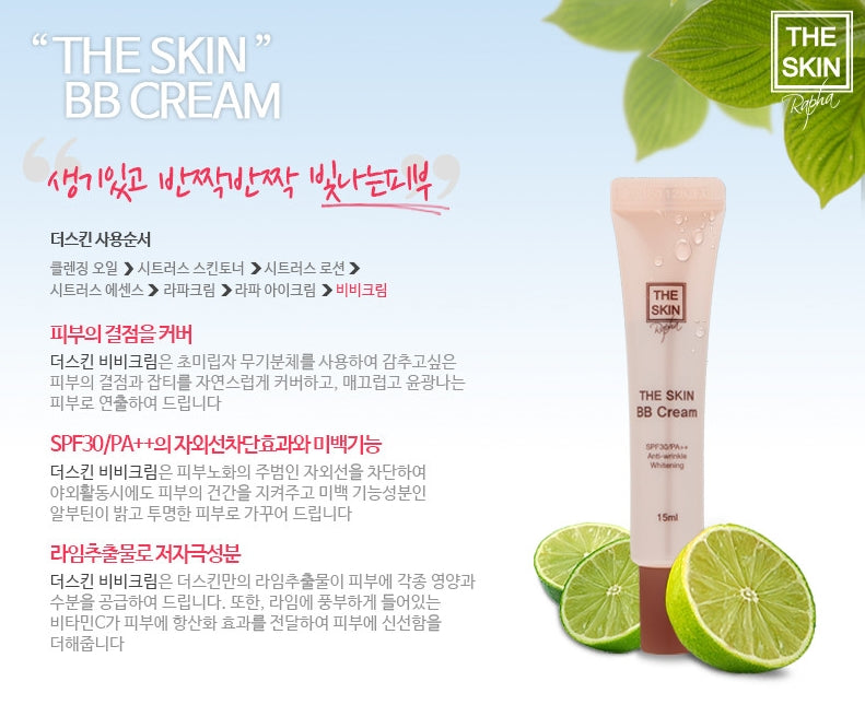 THE SKIN BB Cream creates a smooth and flawless complexion with lustrous glow. It protects the skin from UV rays to keep your skin healthy, while the brightening ingredient Albutine improve your skin bright and clear. THE SKIN BB Cream enriched with their signature lime extract, moisturize and nourish the skin. Also the abundant vitamin C in lime, delivers antioxidant effect to the skin, leaving the skin fresh.