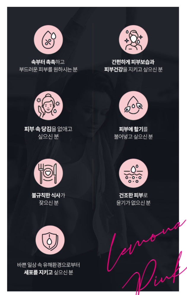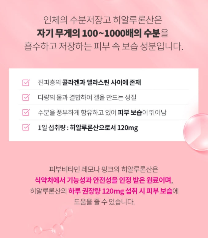 Lemona Pink's hyaluronic acid is a raw material that has been recognized for its functionality and safety by the Ministry of Food and Drug Safety, and can help moisturize your skin when you consume 120mg of hyaluronic acid per day.