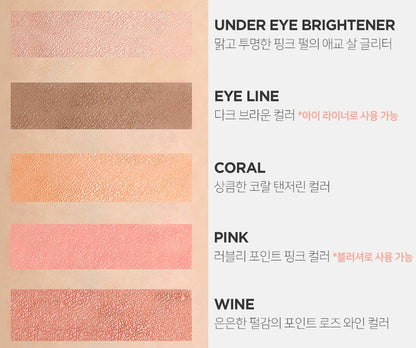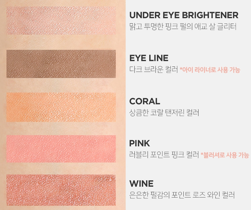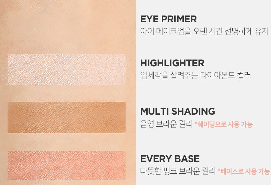 9 daily color combinations. Perfect color layering no matter what color you mix. With one touch, clear and vivid colors are developed and maintain the same color power as the first time for a long time. Not only eye makeup but also face shading is solved at once. Phyto Soothing Complex helps to sooth tired and irritated skin with frequent eye makeup.