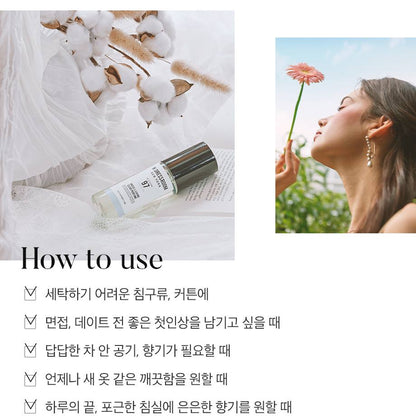 For use in any room, your car or directly on garments and clothes as you iron or after to freshen. Test on an inside seam prior to spraying on delicate fabrics and avoid spraying on finished wood.- Directly spread it to the stinky fiber or space.(in the case of fiber, spread it 20~30 cm apart from the fiber. and refrain using it from leather. For the use of luxuary textile, recommended to use it after testing.