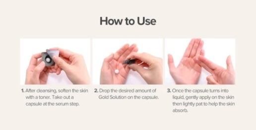 Wash your face and apply your toner. Use as an essence or serum step. With clean hands, place the Collagen Bio Capsule onto the palm of your hand, then open the Gold Solution and pour the ampoule over the capsule and mix with your finger. Gently pat the mixed ampoule onto your skin until it is thoroughly absorbed.